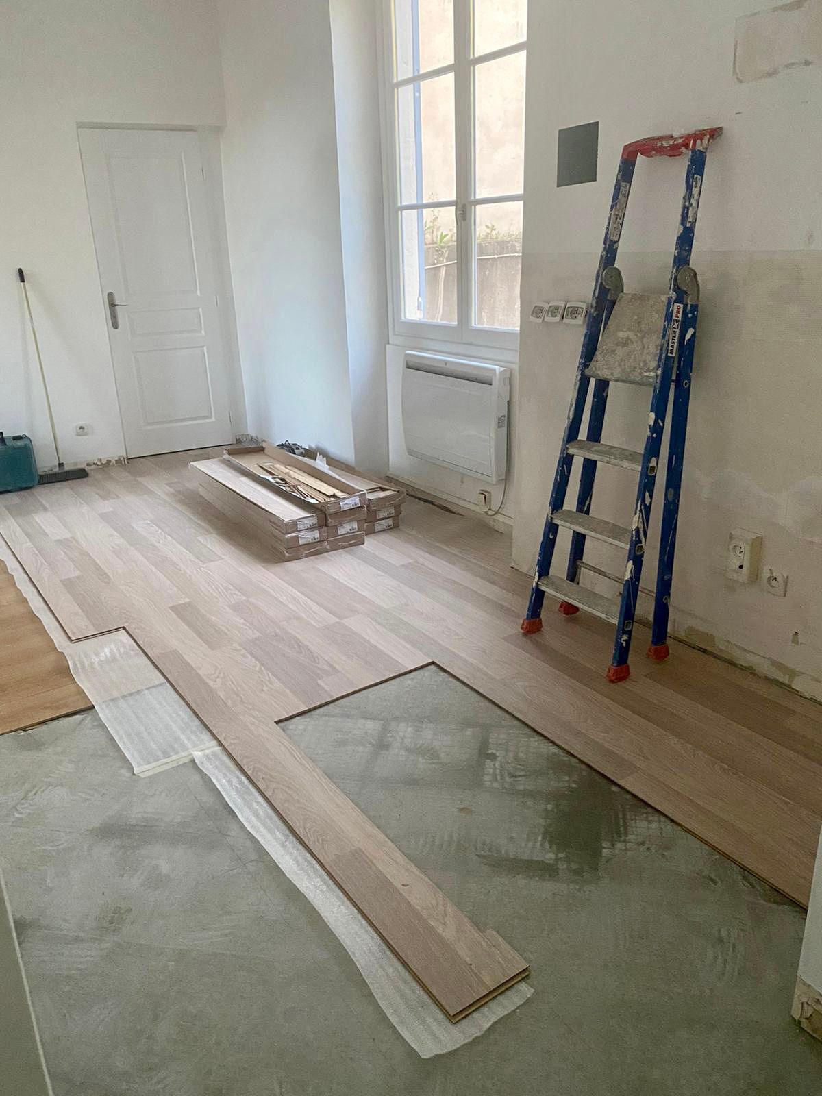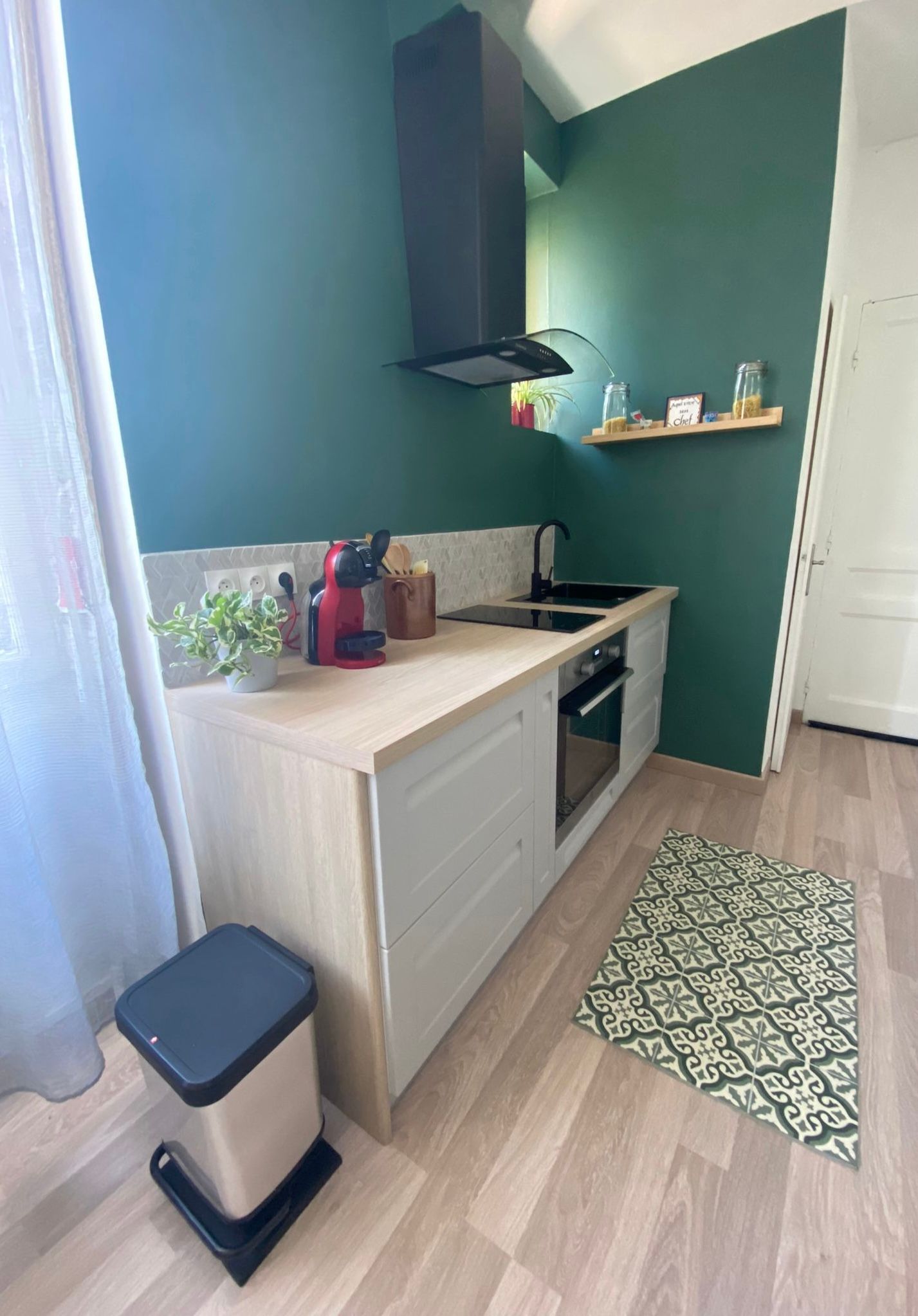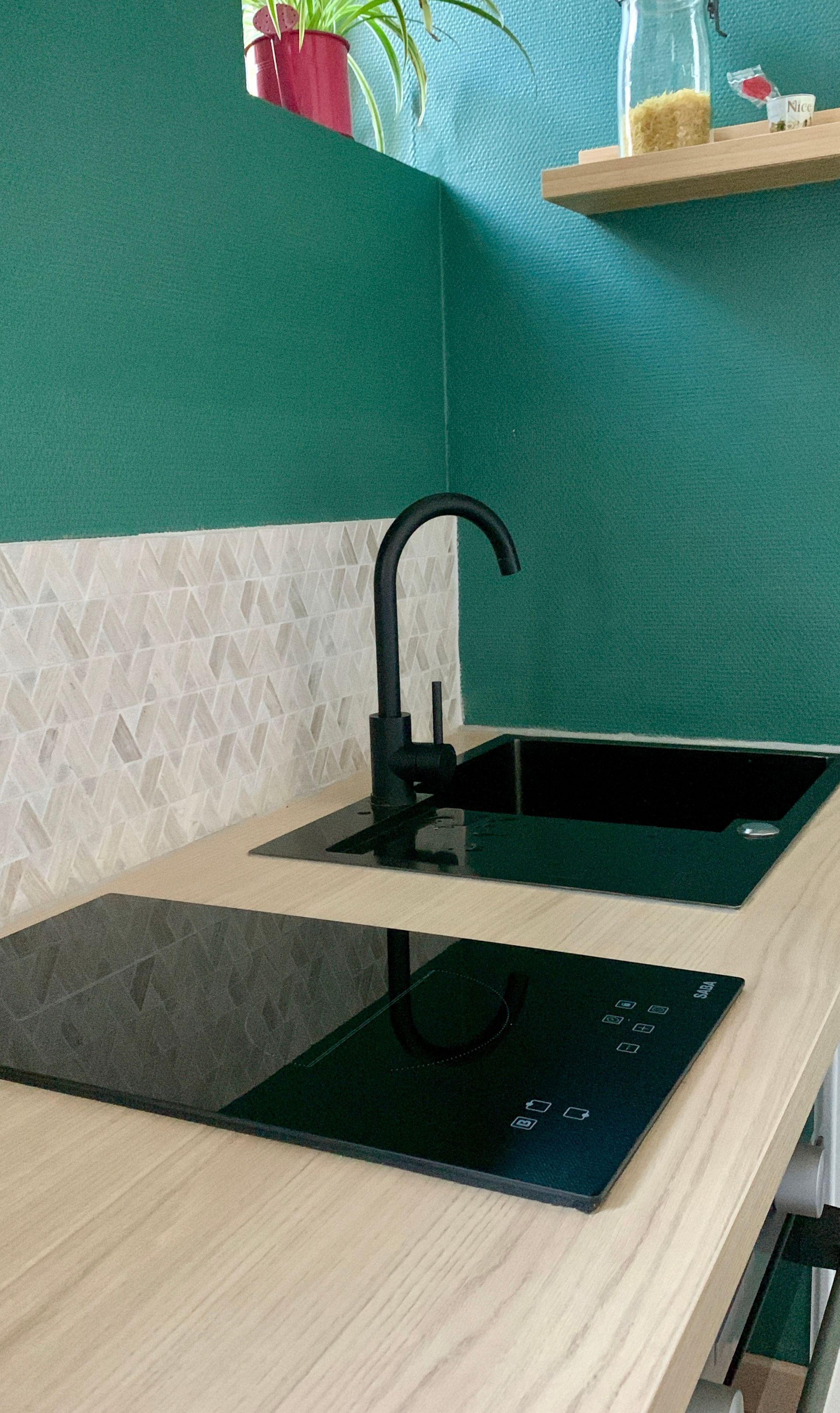 Notre cliente a fait appel à nos services pour réorganiser sa cuisine, initialement en style cuisine anglaise, et l’implanter en linéaire de 2 mètres. Nous avons opté pour des façades grises, un plan de travail en chêne clair, et une crédence en travertin découpé avec des motifs géométriques. Pour le mur, un vert forêt a été proposé, agréablement validé par la cliente.